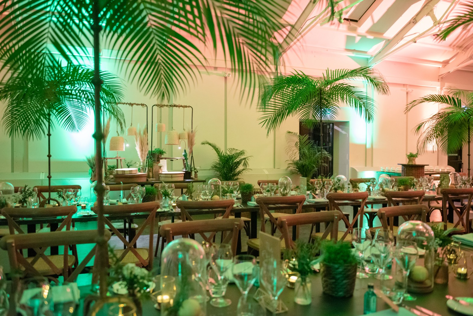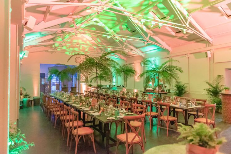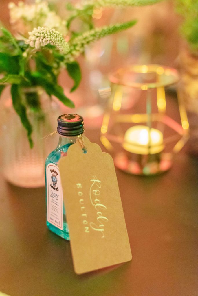 The large room that guests were to dine and dance in started as a blank canvas with incredibly high ceilings so we needed lighting and flowers to create atmosphere as well as make it more cosy. We achieved this with huge palms placed on candlesticks on the tables which were beautifully up-lit with colour washes resembling the plants that grow in the hot houses at the distillery. They acted as a great noise leveller as well as creating impact when guests arrived from the drinks reception. On the tables we placed lemons under cloches along with herbs (coriander, rosemary and camomile) and on the floor, huge ferns in wicker baskets, along with beautiful zinc and bamboo furniture. Each guest received a miniature personalised Bombay Sapphire gin bottle to take home and a baby camomile plant.
