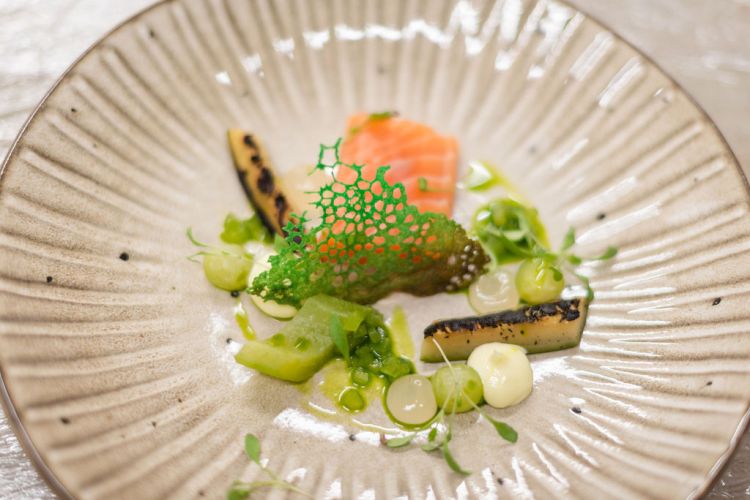 To start, the guests had gin, lemon and coriander infused salmon with cucumber and wasabi emulsion and we substituted melon for salmon for our vegetarian guests.