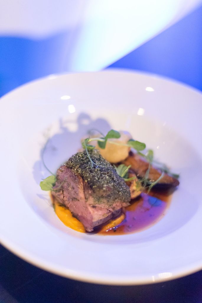 Followed by lamb rump with an orris root and coriander crust, pressed carrot puree, grilled aubergine, tempura sweetbread and a thyme jus with delicious mushrooms instead of lamb for vegetarian guests.